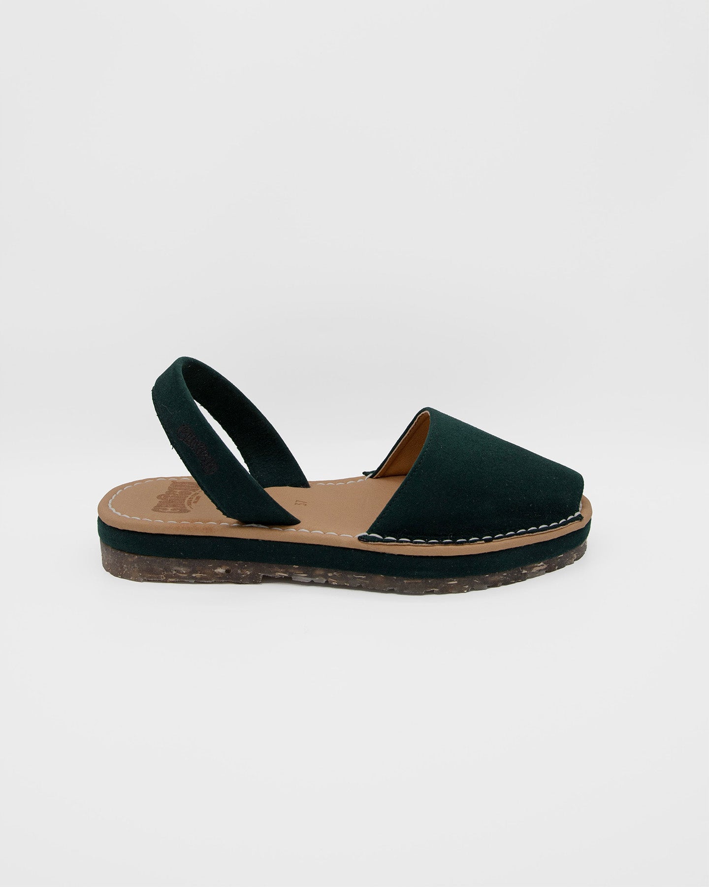 Abarca menorquina de tejido vegano efecto ante en color verde con planta acolchada para una comodidad inigualable. Perfecta para las isleñas.